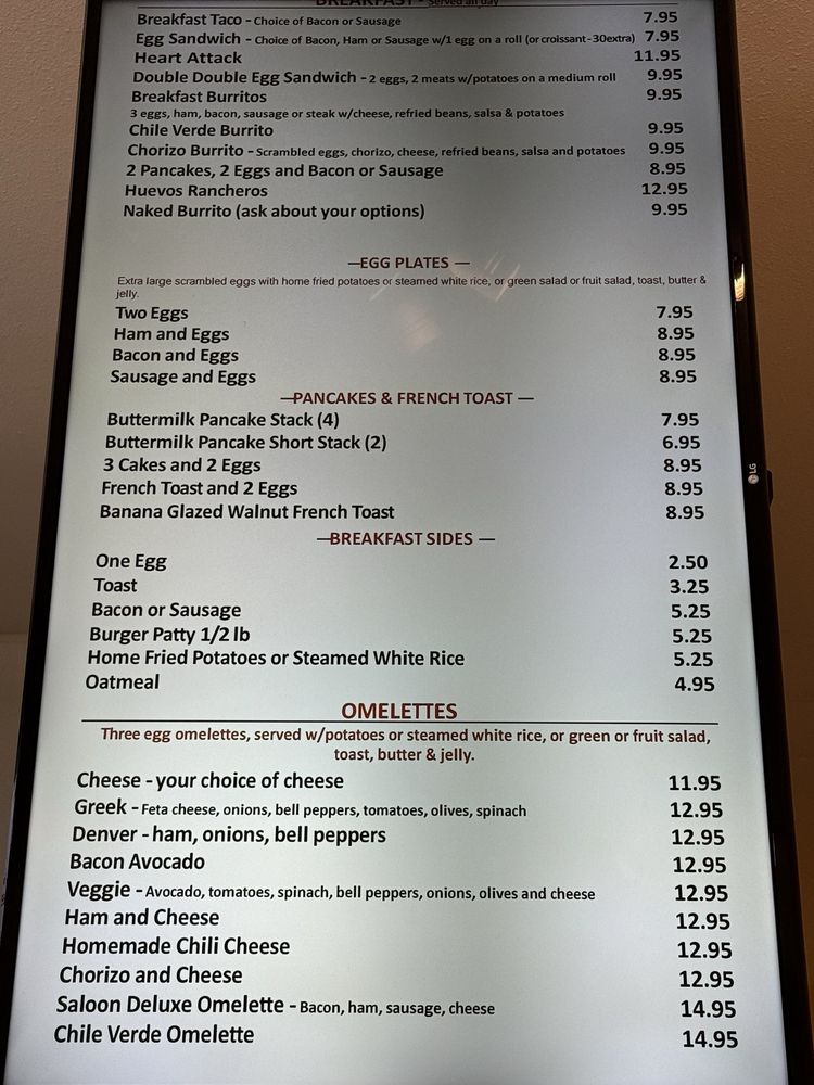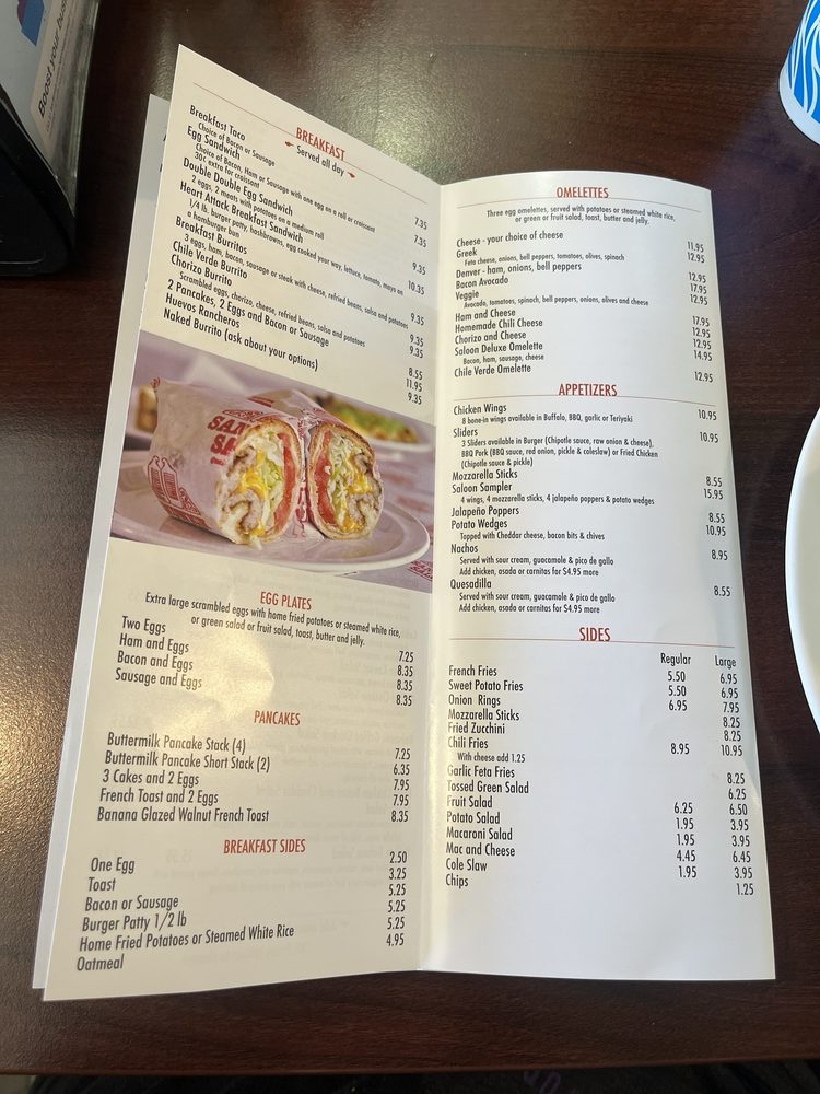 3 eggs, carne asada, ham, bacon or sausage with cheese, refried beans, salsa, and potatoes.