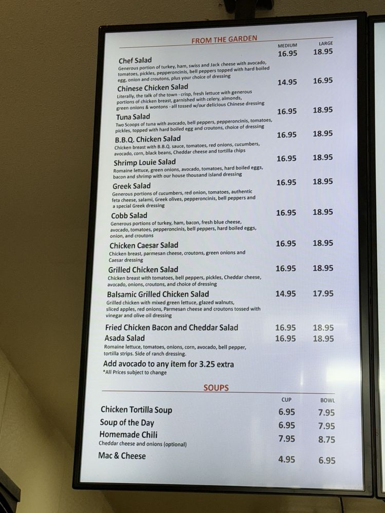 Bacon, fried chicken, lettuce, cheddar, tomatoes, bell peppers, pepperoncini, pickles, cucumbers.