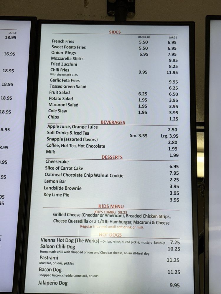 Chili, Thousand Island, lettuce, tomato and pickles. Homemade patty with 1/2 lb. of meat.
